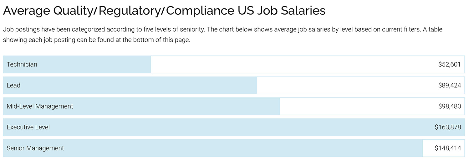 The report is also not a survey of current quality management professionals. Instead, it’s based on publicly available salary data from job postings on Indeed. This approach allows more up-to-date, market-reflective insights every month, because Indeed.com is one of the most popular job boards online with a large database of job postings. (The objective is to create a categorization system that provides meaningful insights and supports reader analysis objectives. Because of this iterative process, data collection and reporting methods may be adjusted as more data and feedback are gained.)