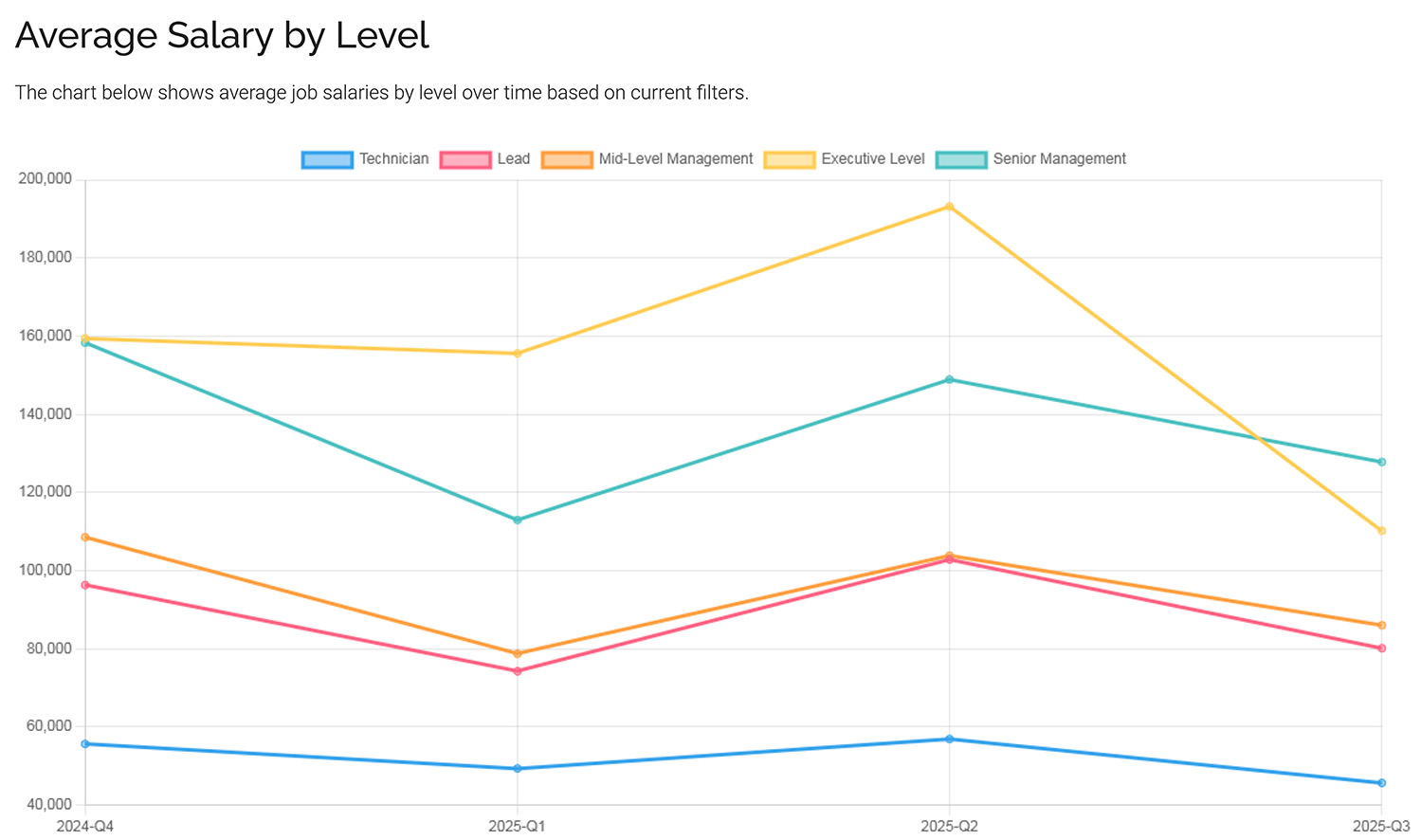Q1 2025 and September-only Q3 2025 showed lower averages, with minimums around $70,000 and maximums in the high $80,000s to mid-$90,000s. Those quarters were more heavily weighted toward technician and lead roles, which helps explain the lower overall averages.