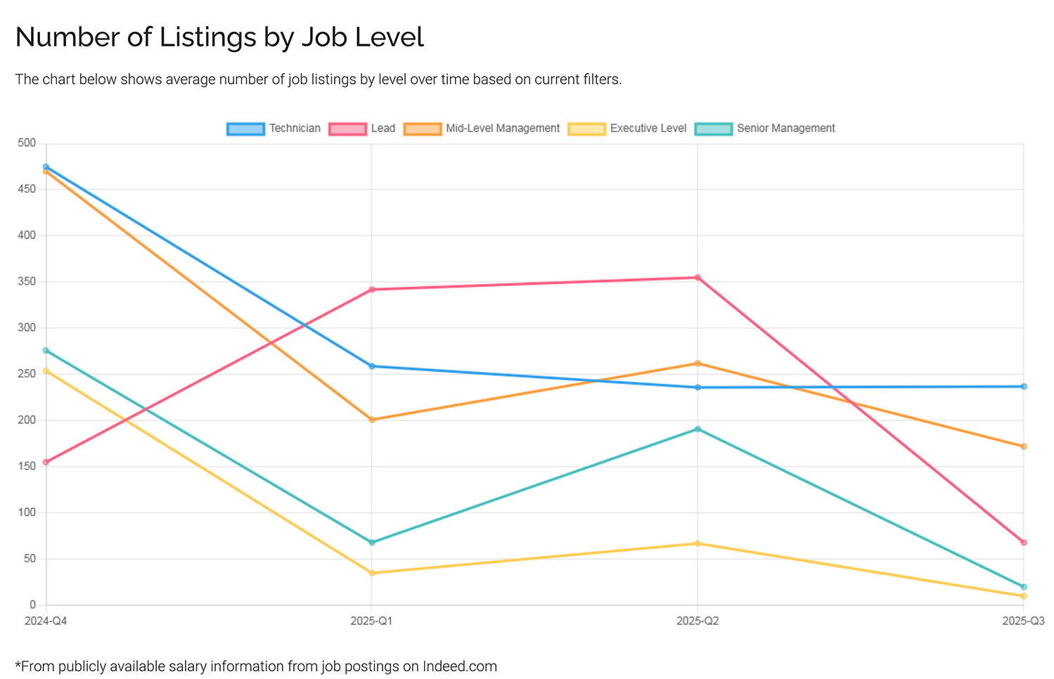 • Q3 2025, based on September only, shows a smaller sample but a clear tilt toward hands-on roles: 237 technician and 172 midlevel management postings vs. only 20 senior management and 10 executive roles.