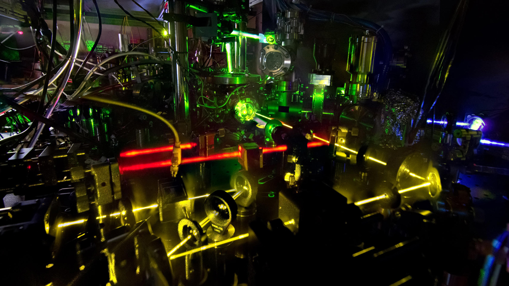 One of NIST’s ytterbium lattice atomic clocks: NIST physicists combined two of these experimental clocks to make the world’s most stable single atomic clock. The image is a stacked composite of about 10 photos in which an index card was positioned in front of the lasers to reveal the laser beam paths. Credit: N. Phillips/NIST