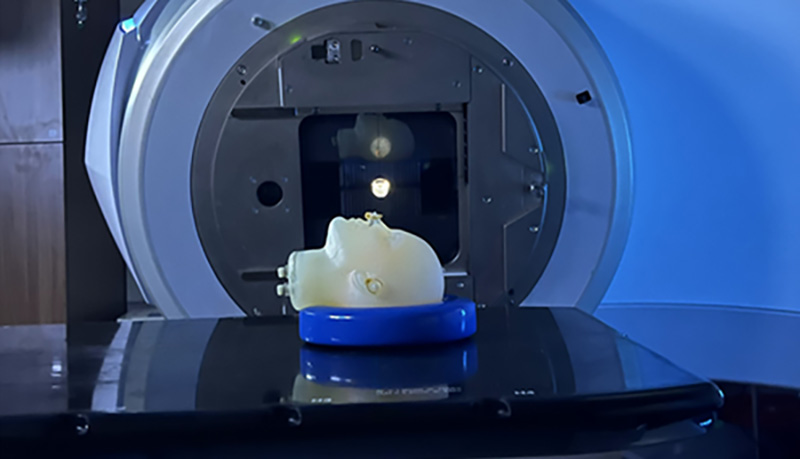 The head replica, called a phantom, contains a special radiation-sensitive gel. The gel is mostly water, and it mimics tissue. The phantom also contains special polymers that change their chemistry when exposed to radiation.