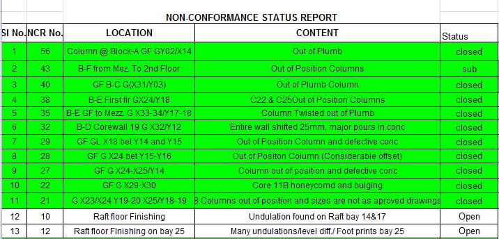It’s a report to track whether an NCR is closed or still open. This report shall be regularly checked and updated. As I mentioned in this post 10-project-forms-that-a-qaqc-engineer-must-have that the NCR shall serve as hold points of payments so it should be immediately rectified and closed. See below a sample of the report.