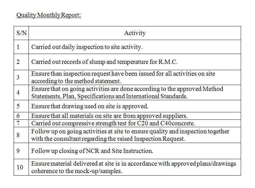 This report shall be submitted to the Quality Manager, he requires me to submit a report of my areas of function such as closing nonconformance report or NCR, closing Site Instruction, Site Inspections, Issues discuss at the quality meeting, Development of Method statements and status, ITP, and Checklist status, etc. See the sample format of the report.