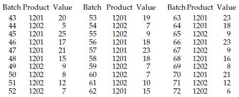 Unit 12 is used to make Products 1201 and 1202. The final characteristic for Product 1201 has a target value of 19.0, while the final characteristic for Product 1202 has a target value of 8.0. Batches 43 through 72 contain short runs of both products.