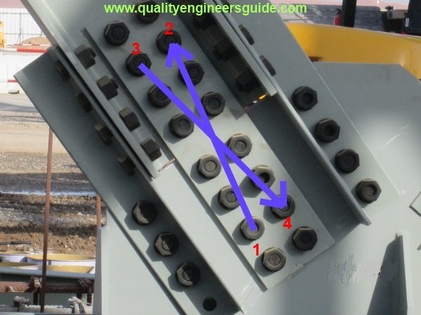 If you are in the connection plate consists of a group of bolts shown in the above photo. Let us have an example to just explain how the system of checking. The tightening would start either from the bottom corners of the plate, let us say you would want to start at lower left corner and then cross in the upper right corner of the plate and vice-versa.