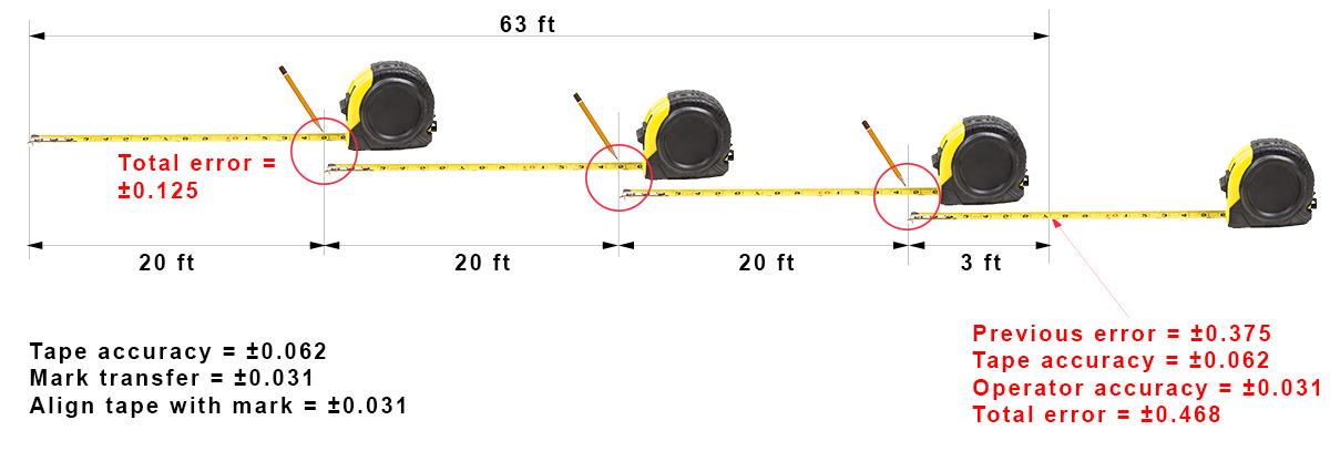 But suppose all you have is a 20-ft tape with an accuracy of about one-sixteenth inch (0.063 in.). You’ll have to make four back-to-back measurements to measure 63 ft. However, each time you make one of those moves, you’re adding three sources of error: tape-measure accuracy of 0.063 in.; how accurately you marked the wall with your pencil at the 20-ft mark (call that 0.031 in., about one-thirty-second in.); and how accurately your measurement assistant holds the end of the tape at that mark so you can extend the tape another 20 ft (call that an additional 0.031 in.).