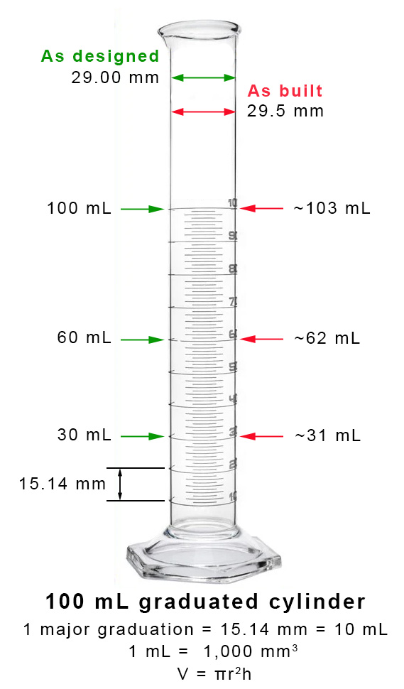 That difference is about the thickness of a high-quality business card. But when that error is plugged into the equation for the volume of a cylinder, it translates to about a 3.5% error. That means that at 30 mL, the reading would be off by 1 mL; at 60 mL, the error would be about 2 mL; and at 100 mL, the error would be greater than 3 mL, three times the stated accuracy of the graduated cylinder—all due to an error no bigger than the thickness of a business card.