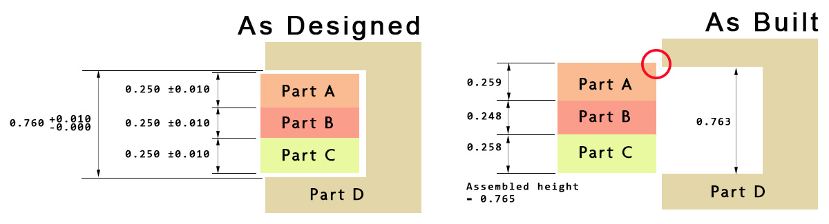 Figure 2: In this example of tolerance stack-up, even though all parts are built within tolerance, the final assemblies won’t fit together.
